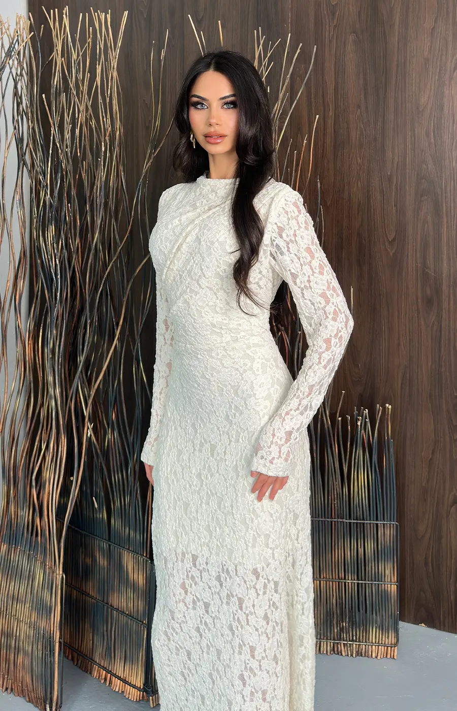 Zarif dantel dokusuyla romantik bir stil sunan bu maxi elbise, vücudu saran formu ve şık dik yaka detayıyla özel günlerinizin vazgeçilmezi olacak. Hem modern hem de zamansız bir şıklık arayanlar için ideal.