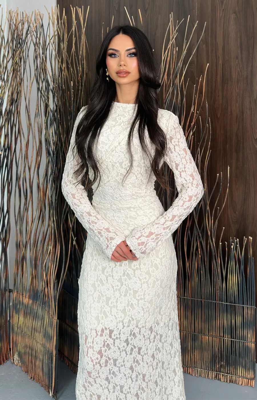 Astarlı Dantel İşlemeli Uzun Kollu Maxi Elbise – Ekru