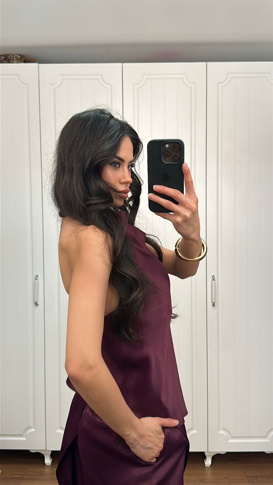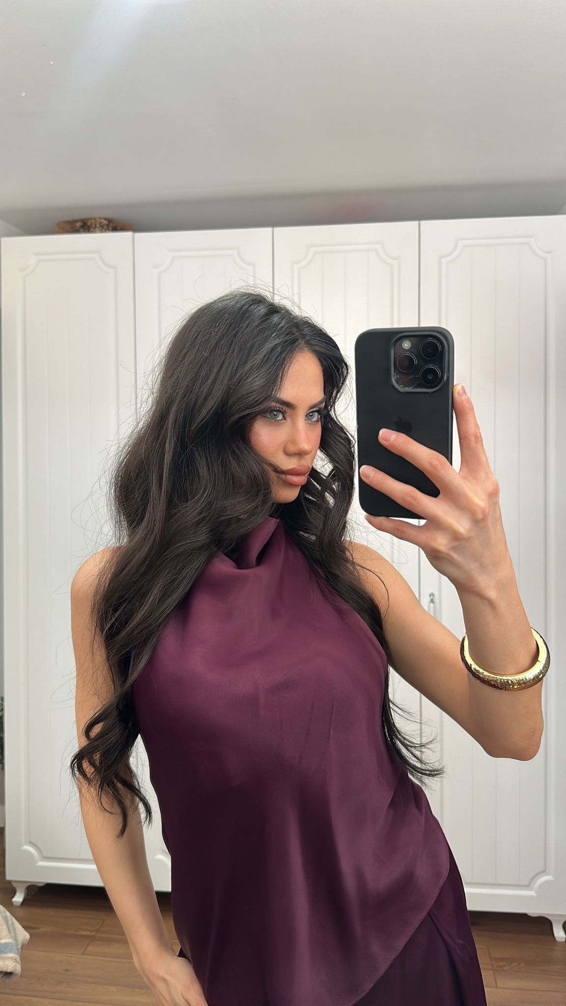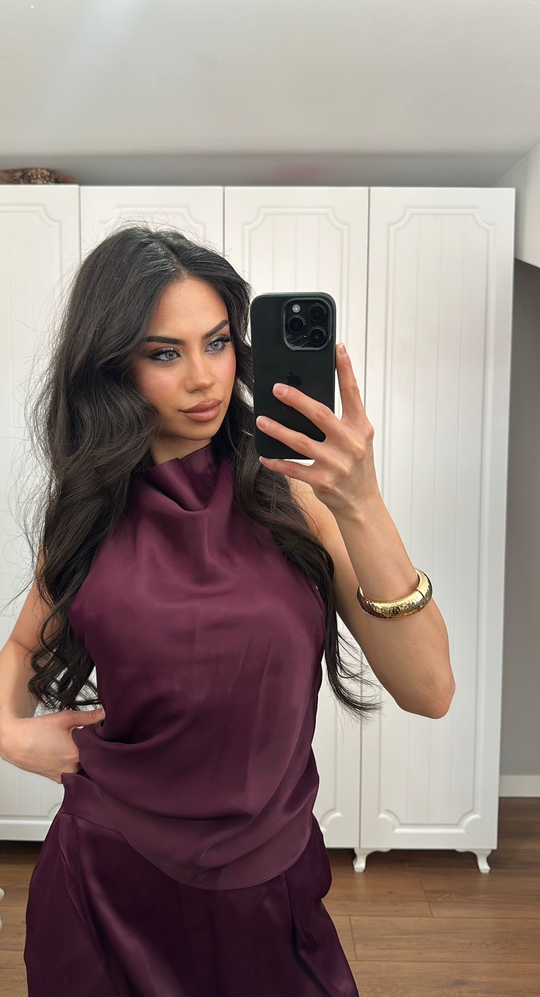 “Saten dokusunun lüks hissini, modern degaje yaka detayıyla birleştiren bu bordo takım, çabasız bir şıklık sunuyor. Akışkan yapısı ve yüksek bel pantolonuyla hem davetlerde hem de şık akşam yemeklerinde kusursuz bir silüet oluşturun.”