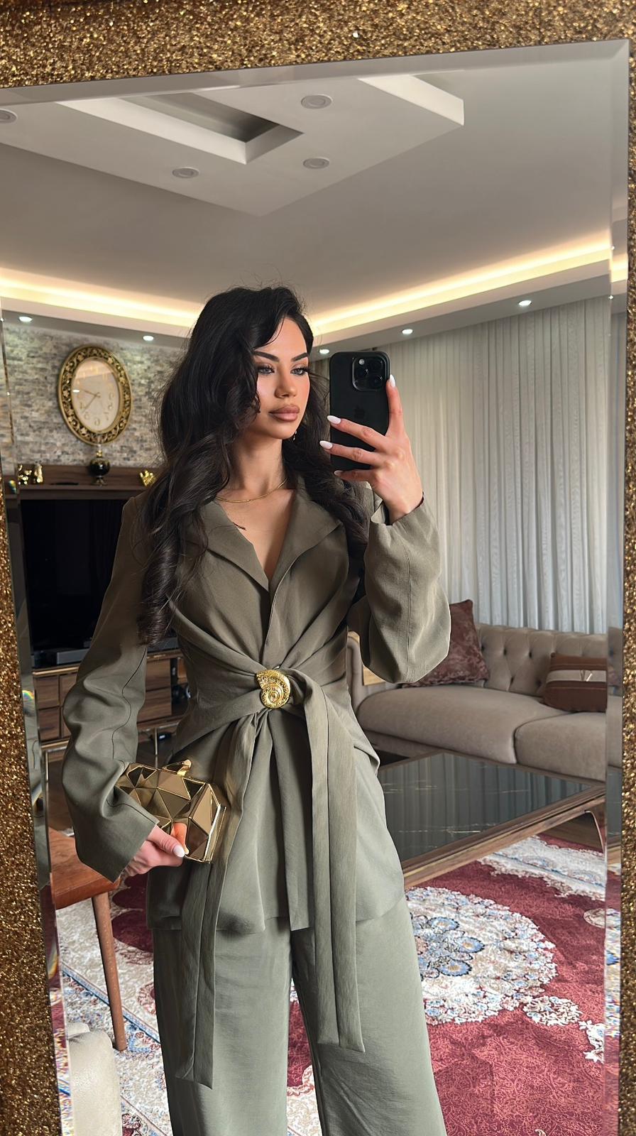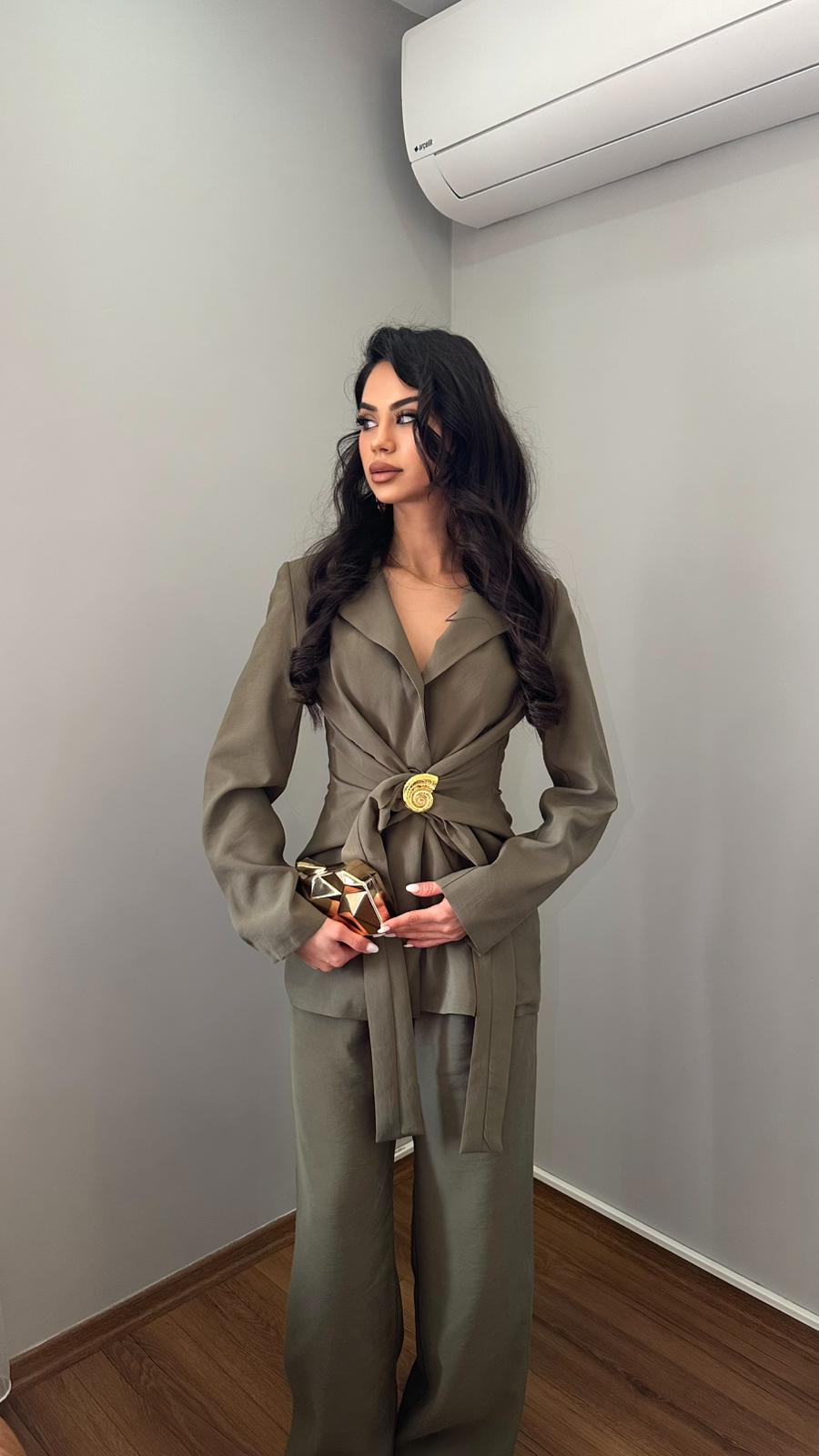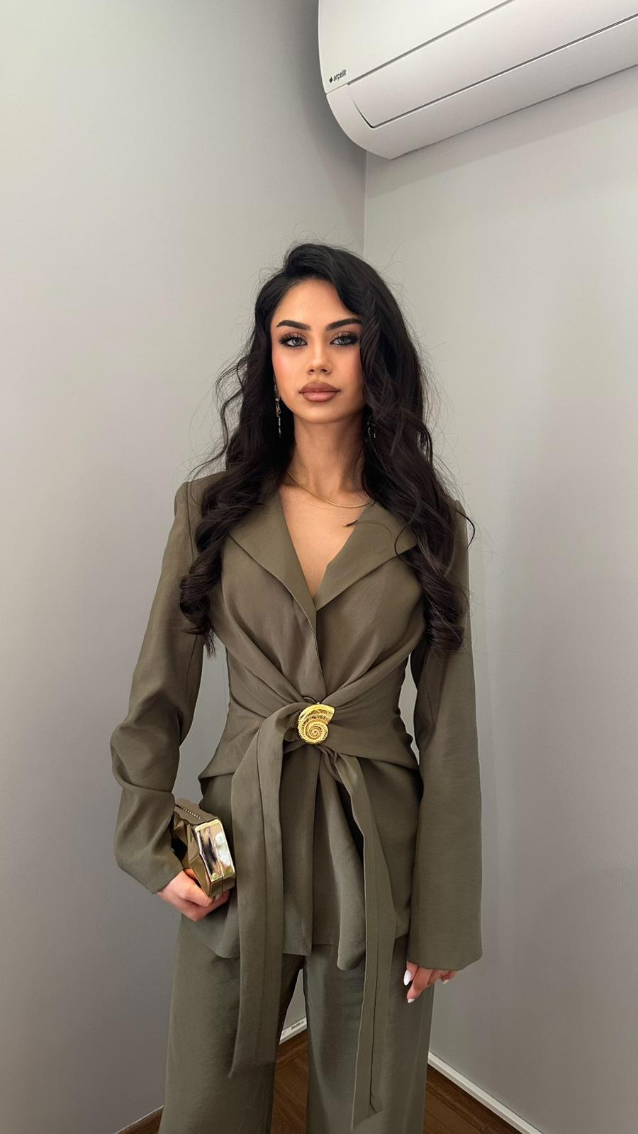 Haki Belden Bağlamalı Ceket/Pantolon Takım