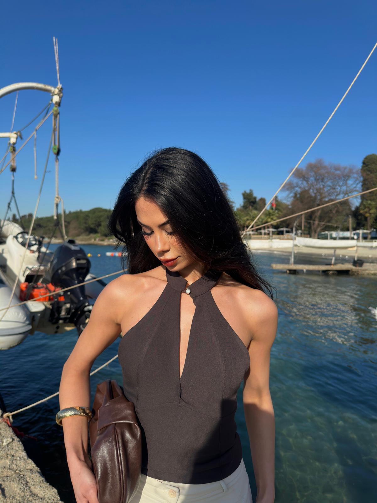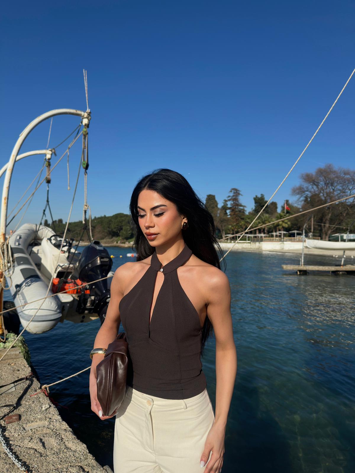 Halter Yaka Taş Detaylı Bluz – Kahve