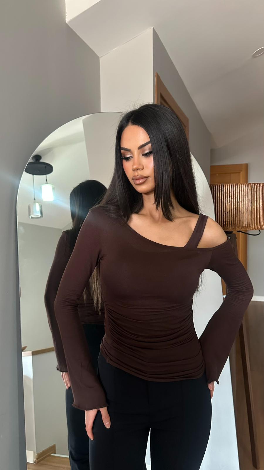 Kayık Yaka Uzun Kollu Bluz ve Askılı Atlet Takımı – Kahverengi