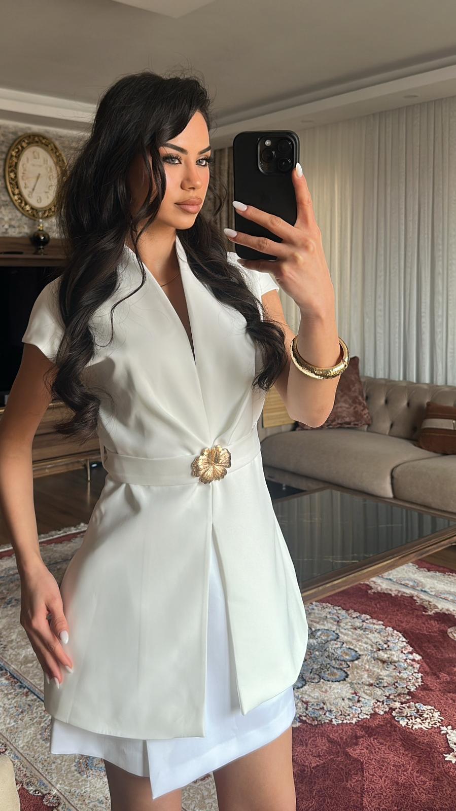 Modern ve güçlü bir silüet arayanlar için tasarlanan bu ekru yelek, Falé koleksiyonunun en seçkin parçalarından biri olarak öne çıkıyor. Minimalist tasarımı, çarpıcı aksesuar detayıyla birleşerek sofistike bir görünüm sunar.