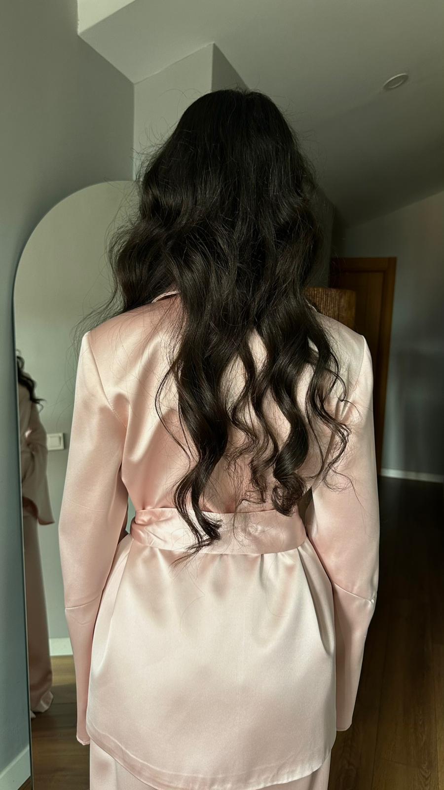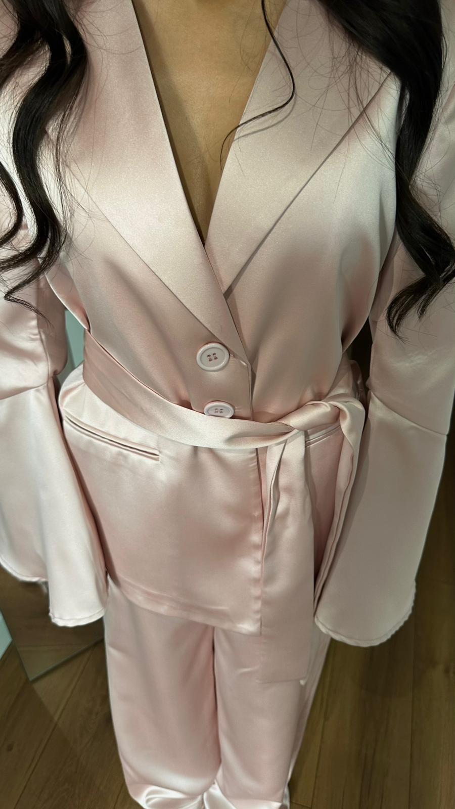 Özel Tasarım Saten Abiye Takım: İspanyol Kol Blazer & Palazzo Pantolon – Rose Pearl
