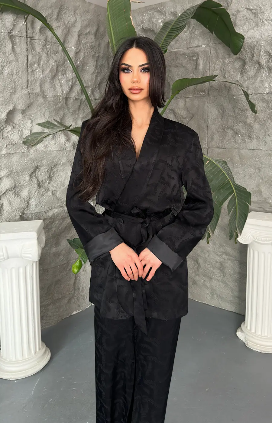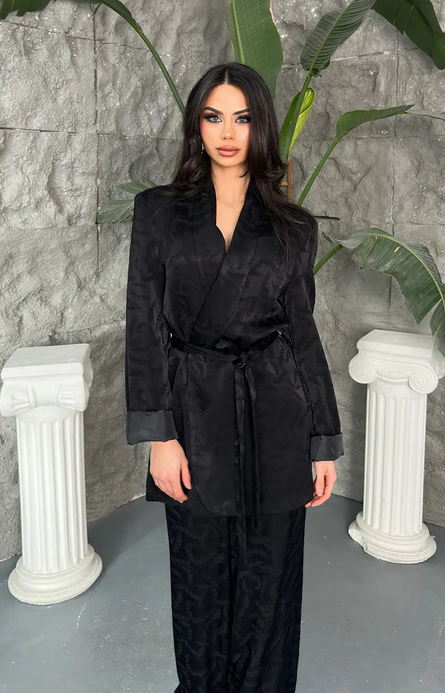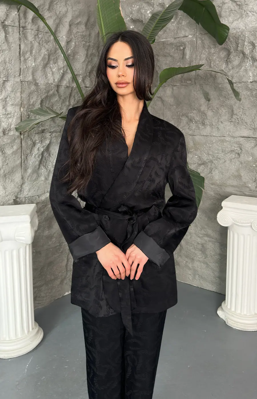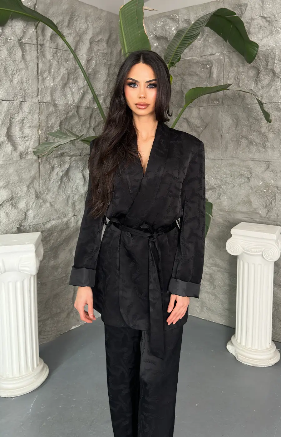 Siyah Jakar Desenli Kuşaklı Saten Ceket & Pantolon Takımı