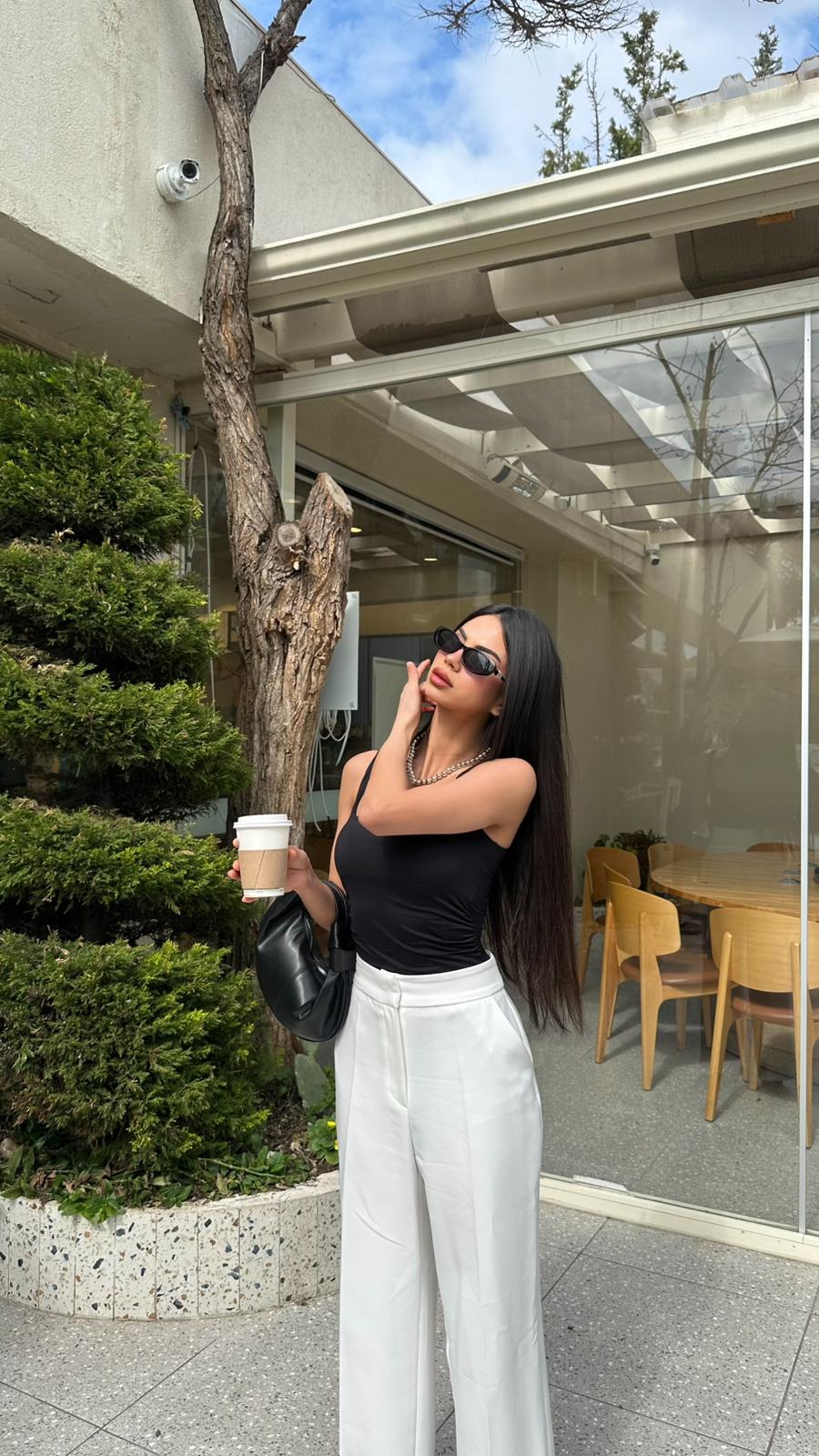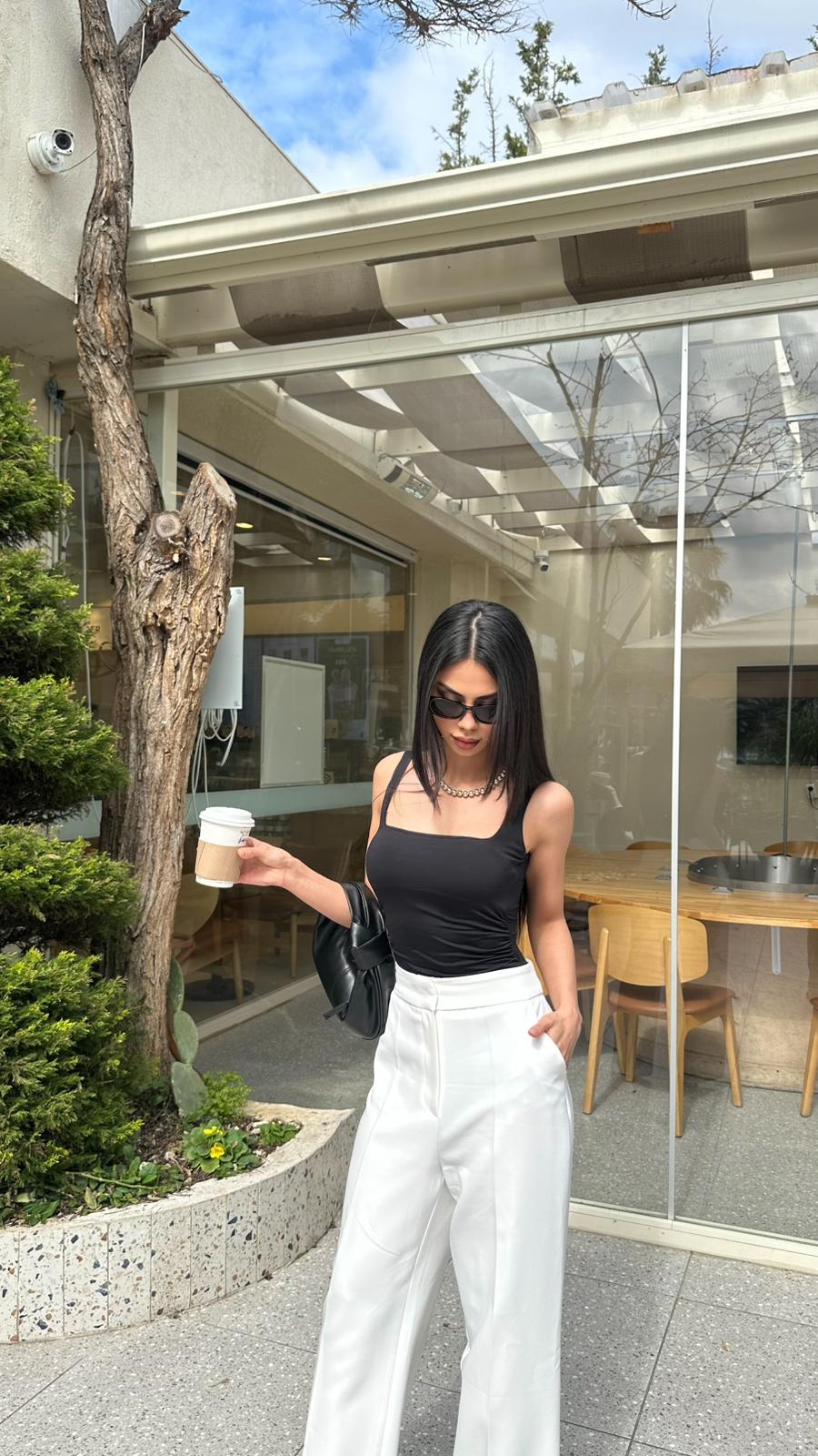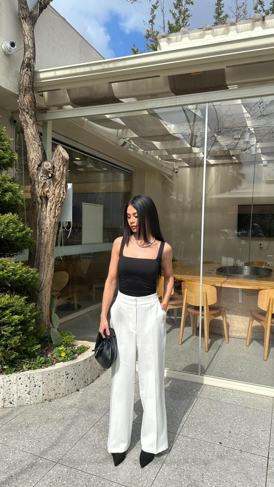 “Beyaz pantolon kombinlerinde konfor ve güven bir arada! Özel dokusu sayesinde asla iç göstermeyen bu yüksek bel pantolon, geniş paça kesimiyle hem ofis stilinizde hem de günlük şıklığınızda kusursuz bir silüet oluşturur.”
